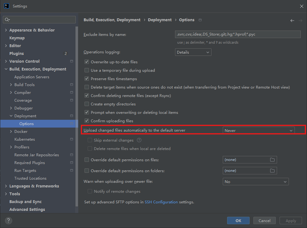 自动将更改的文件上传到默认服务器 → 选择 从不