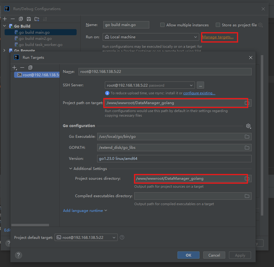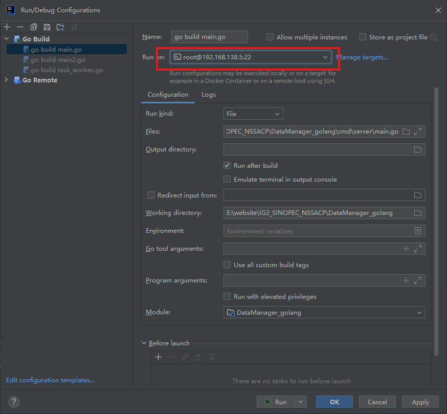 在父窗口Run on处选择刚才配置的虚拟机地址